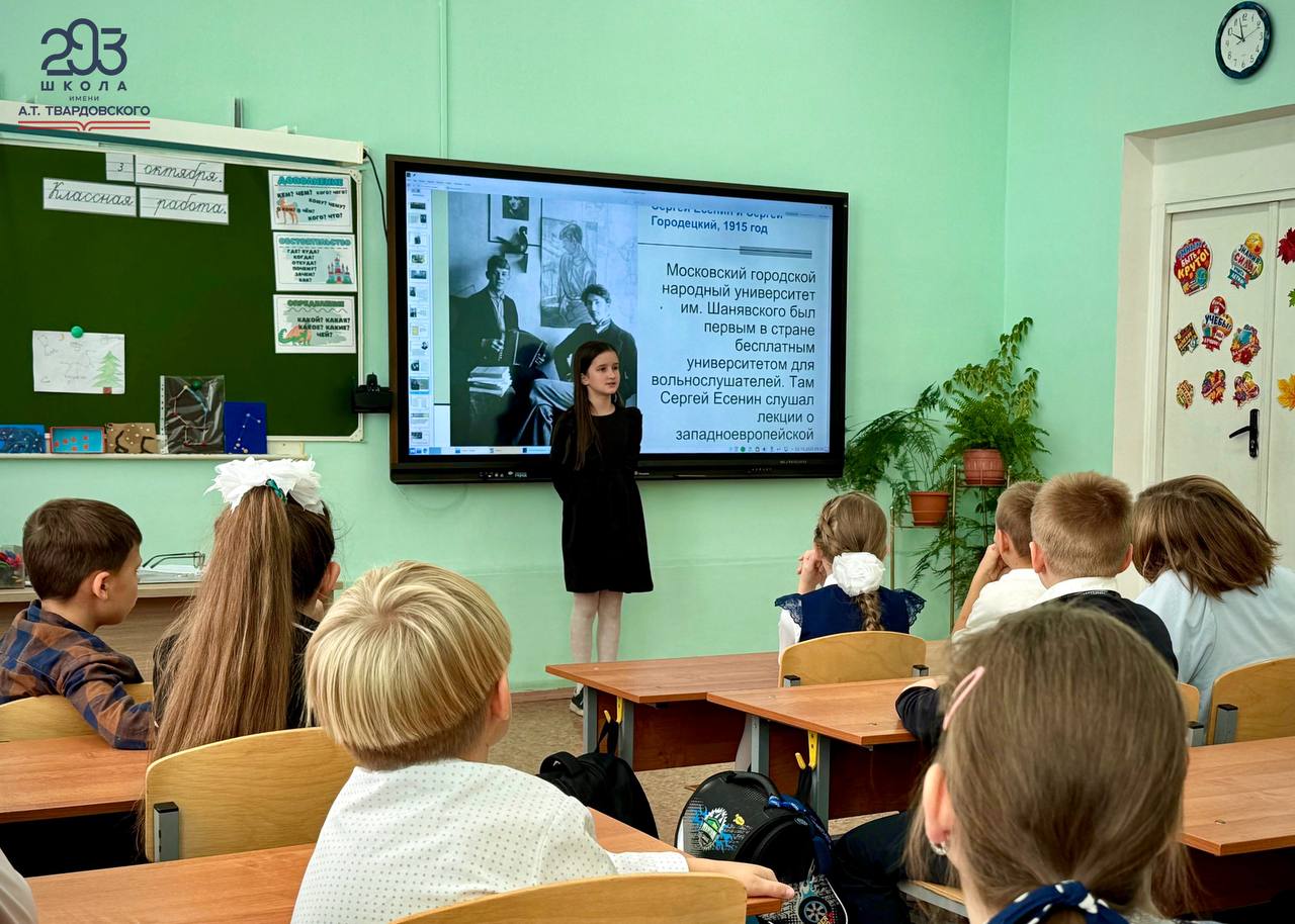 Наш замечательный педагог-библиотекарь Елена Павловна Тарасова рассказала ребятам, как в детстве на живописных просторах Рязанщины формировался поэтический дар Есенина, а ребята из 6 «В» в свою очередь прочитали стихи поэта.