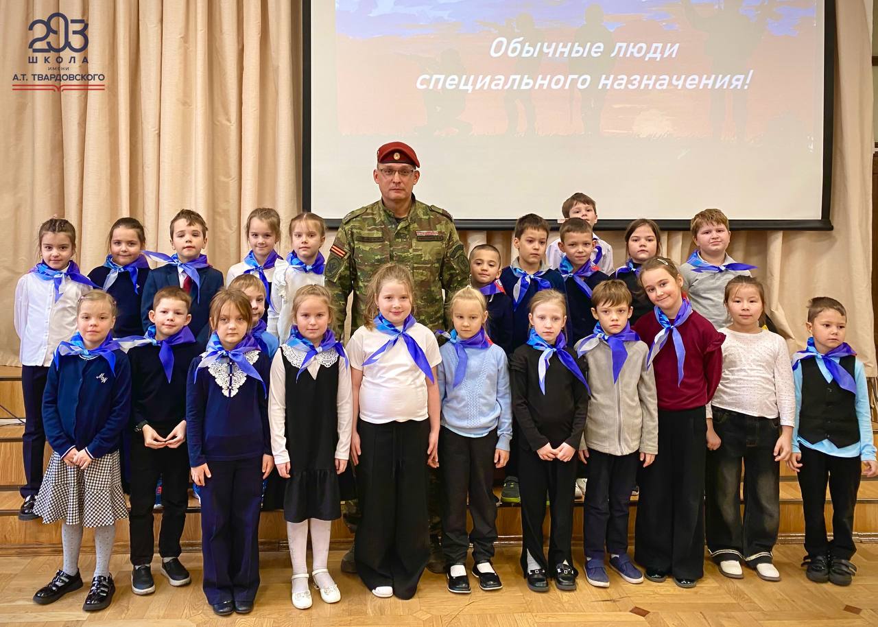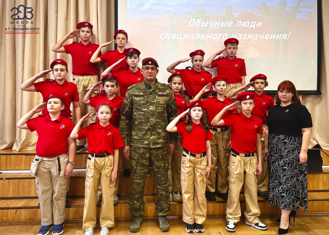 В День подразделений специального назначения к ученикам начальной школы и юнармейцам отряда «Русские витязи» пришел удивительный гость - командир подразделения специального назначения «Сатурн», полковник внутренней службы Борис Владимирович Николаев.