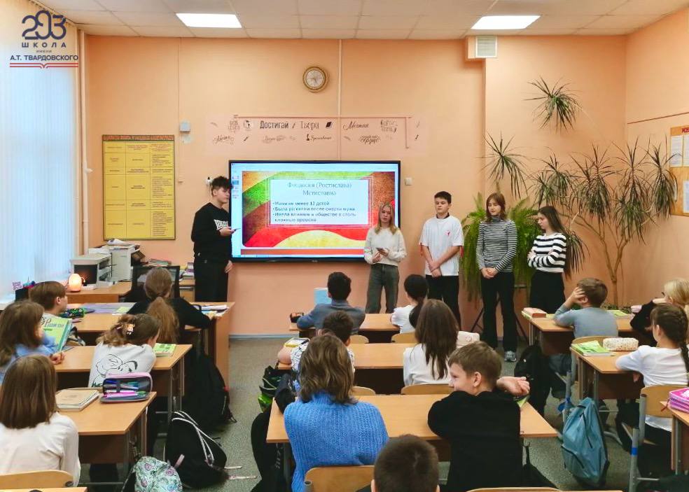 Особое внимание было уделено маме великого полководца и государственного деятеля Александра Невского. Ученики рассказали множество интересных фактов о её жизни и о том, как она повлияла на формирование его личности. После рассказа развернулось живое обсуждение между учениками, где каждый смог поделиться своими мыслями и впечатлениями.