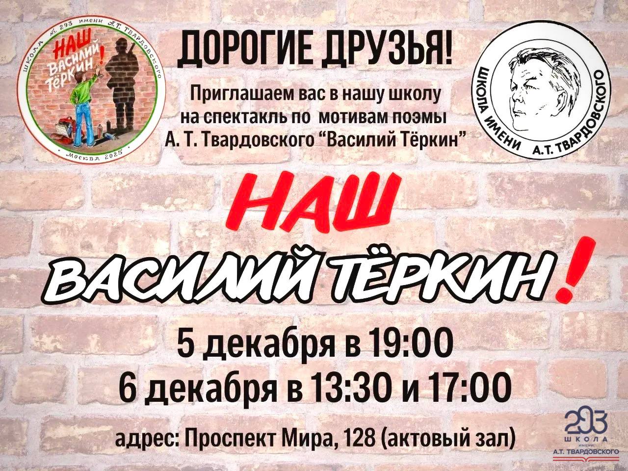 Дорогие друзья! «Театр школы Твардовского» рад пригласить вас на спектакль «Наш Василий Тёркин», который состоится в нашем уютном школьном корпусе по адресу: проспект Мира, 128, на 4-м этаже.