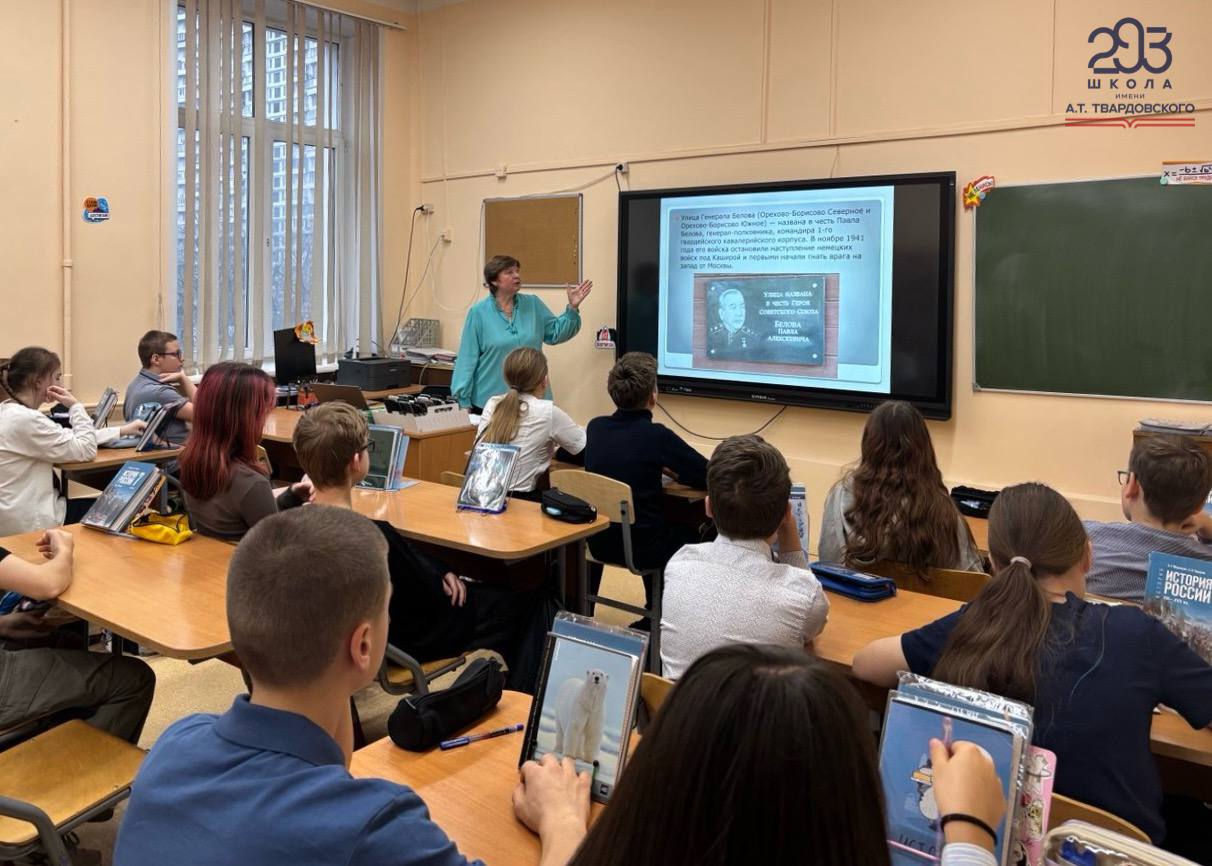 «Спасибо большое нашему учителю истории Светлане Юрьевне Радушкиной за такой интересный урок. Мы узнали о 28 героях-панфиловцах и политруке Клочкове. Они героически сражались на подступах к Москве», — поделилась с нами своими впечатлениями Таня из 7 «В» класса.